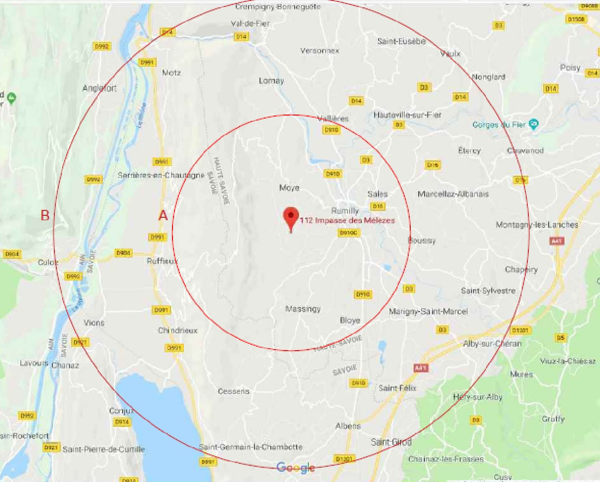 -3 rayons d'intervention A ,B et C (10 km, 20km et 30km) départ de Moye